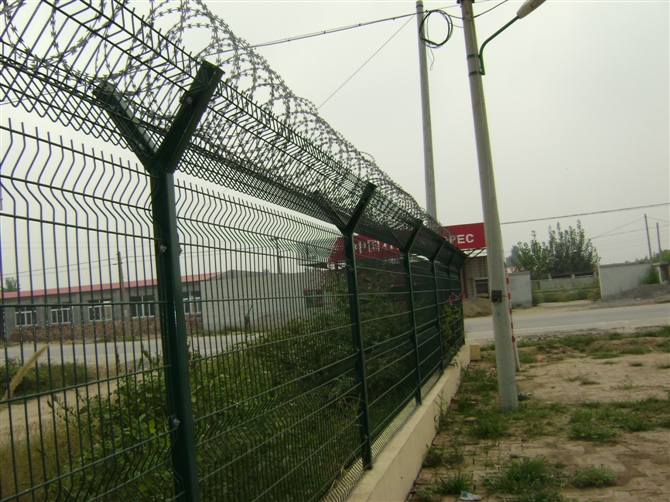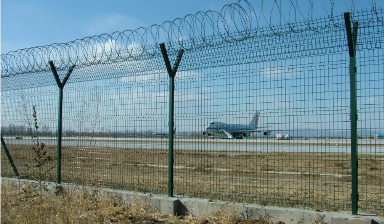機(jī)場圍界網(wǎng)又稱作機(jī)場隔離柵“Y型安全防御護(hù)網(wǎng)”,是由V型支架立柱,加強(qiáng)型焊接片網(wǎng),安全防盜連接件和熱鍍鋅刀片刺網(wǎng)組成強(qiáng)度和安全防御性級別很高。近年來,被廣泛應(yīng)用在機(jī)場,軍事基地等高安全場所。