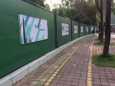 圍擋基腳采用M10水泥砂漿砌筑MU10頁巖磚磚砌0.5*0.5的基礎(chǔ),用于增強圍擋抗風穩(wěn)定性;pvc圍擋設(shè)2.5米高,寬3米為一板。施工圍擋做美化處理,噴涂企業(yè)名稱、安全、質(zhì)量、文明施工用語及開發(fā)項目商業(yè)廣告,嚴禁張貼、涂寫垃圾廣告。