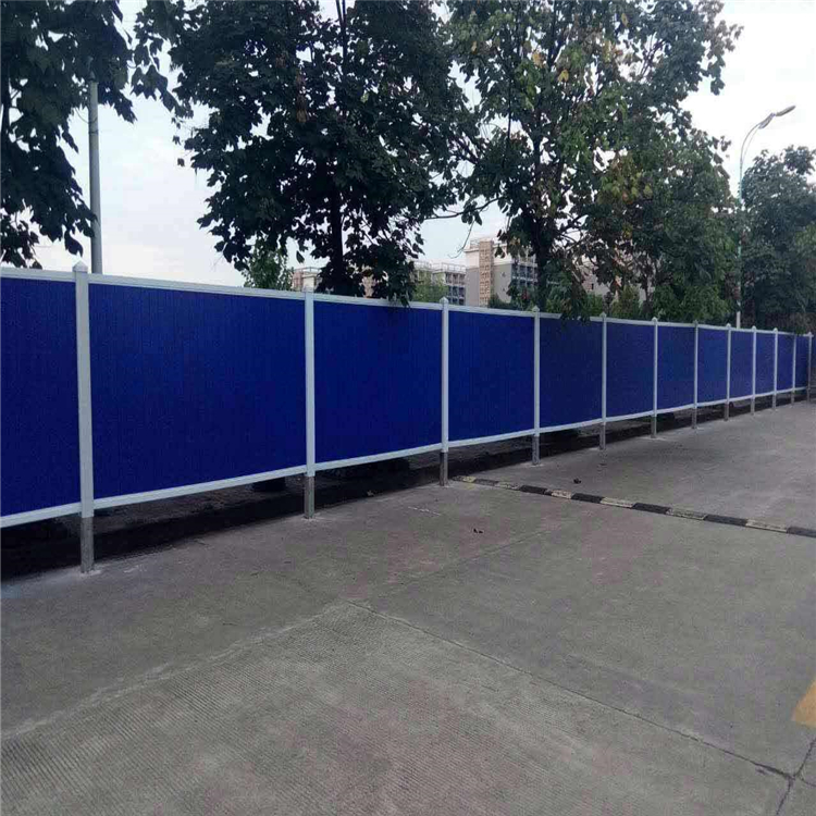 施工圍擋采用藍(lán)色輕質(zhì)夾心彩鋼板,彩鋼厚度為0.3mm,高度2米,圍擋頂部及底部分別設(shè)置10cm高的鋼槽壓頂和鋼槽托底,每隔2.9米設(shè)一個(gè)錨固于地面的鋼立柱,立柱下座為50cm×50cm×50cm的C25砼基礎(chǔ),鋼柱底板四角采用膨脹螺栓與混凝土基礎(chǔ)連接固定,既可以減少占地,又可讓圍擋穩(wěn)固、整齊、美觀
